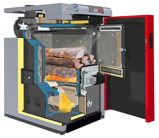 Принцип работы такого агрегата заключается в процессе тления, не предусматривающий ярко выраженного горения. Тепло, выделяемое в процессе горения, двигается в конструкцию теплообменника.